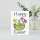 A sweet Easter basket in spring colours, with coloured eggs and flowers. Text reads, "Happy Easter".