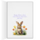 Adorable Easter Bunny sitting on a tree stump with butterflies, dragonflies, mushrooms and pretty Spring flowers.