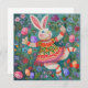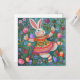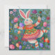 Happy Easter! A happy Easter bunny dances in flowers with decorated eggs.