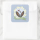 This Happy Easter square sticker features a pretty floral daisies happy easter wreath with grey bunny ears and butterflies on a blue background.