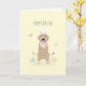 A cute illustration of a golden retriever dog wearing bunny ears and a cute Easter bandana. Surrounded by decorated Easter eggs, spring flowers and butterflies.