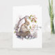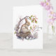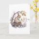 An Easter greeting card featuring a watercolor illustration of a bunny sitting in a nest under a blossoming Cherry tree with Easter eggs and pink and white watercolor flowers in the forefront of illustration. The wording "Happy Easter" is positioned to the lower right of card in a colour to match the illustration. The inside of card left blank for a personal greetings and a small brown bunny added to the back of card for a whimsical touch.