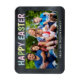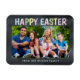 Modern photo Easter magnet. Design features colorful typography script ''Happy Easter'' in spring pastel colors , family photo and single line with a family name on the chalkboard texture background.