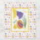 Original illustration in oil pastel of a large colorful decorated Easter egg with a little chicken, sunshine and grape hyacinth. With customizable text saying Happy Easter and Easter floral pattern frame. On the back side is blank space for writing a name or wish.