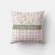 Spring throw pillow featuring an Easter-themed design. The top section of the pillow displays a pastel-coloured pattern of decorated Easter eggs, delicate flowers, and leafy branches on a light background. The middle section contains a muted green band with the text "Happy Easter" written in elegant white font. The text can be customized to your preference. The bottom section showcases a pink and white gingham plaid pattern, adding a cozy, country-style charm. The combination of soft pastel tones and festive motifs creates a warm and cheerful aesthetic perfect for Easter décor.