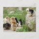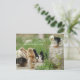 Easter postcard with baby chicks photography. The cutest baby chicks ever are featured on this Easter greeting where one little black and white chick stands on a rock watching a parade of tan, black and yellow chicks pass by. The greeting is easy to customize and could say "Happy Spring" and be used for any occasion. There is no text on the back where the background image is feathers.