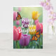 Designed with a spring garden scene, this card shows a field of tulips painted in fuchsia, amethyst, crimson, and warm golden tones, with soft green haze behind them 🌷. Two winged insects hover near the center, their orange-and-black mosaic wings edged with tiny white accents, as if they’ve paused together in midair like close companions. A pale, sunlit glow spreads across the upper background, giving the flowers a gentle shine and making the moment feel quietly affectionate. The message “Happy Easter Daughter” sits centered over the blooms in flowing, dark lettering that stands out against the lighter petals. The words are large enough to read at a glance, with the tallest letters reaching slightly into the brighter area near the top. Around the text, the tulips blur softly while the insects stay crisp, creating a tender contrast that draws your eye back and forth. Small touches of gold and pink peek between stems, and the insects’ wings angle toward each other above the layered tulip heads 🐰.