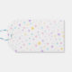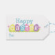 This festive gift tag features text "Happy Easter" with spring coloured Easter eggs in yellow, purple, blue and pink. Back features scattered stars in spring colours. Perfect for Easter baskets and gifts.
