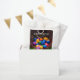 Stylish favour bags feature colourful blue, yellow-orange, purple, green, and pink Easter eggs spilling out of a dark brown Easter basket onto green grass. "Happy Easter" is written across the top in white text.