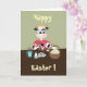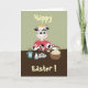A cute Easter greeting card for kids with c cartoon cow named Snowbell , painting Easter eggs .