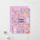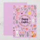 Playful pastel Easter card featuring a floral wreath, cute bunnies, a chick, a fox, decorated eggs and spring flowers. Charming, whimsical design