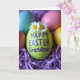 This design shows a lime-green egg-shaped centerpiece with a smooth, glossy surface, set in a cozy spring arrangement 🐰. Across the front of the green egg, the message “HAPPY EASTER Grandson” is placed in strong purple letters, centered and easy to read. Two small daisy-like flowers sit gently on top, their white petals and yellow centers leaning close together like a sweet pair. Around the main egg, other softly colored eggs—pink, yellow, and light blue—fade slightly into the background, giving the scene a friendly, gathered-together feel 🐇. Everything rests in a nest of crinkled paper shreds dyed a light lavender, adding texture and a soft cushion underneath. Warm, gentle lighting brings out a subtle shine on the painted eggs and keeps the flowers looking fresh without harsh shadows. The background stays softly blurred so your eye stays on the purple lettering and the bright green egg. The two daisy-like blooms have crisp white petals and sunny yellow centers perched at the very top of the green egg.