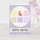 This greeting card features a soft lavender background with a large white circle centered like a spotlight on the design. Inside the circle sits a neat grid of six pastel squares with slightly uneven edges, giving the layout a gentle, cozy look. The squares mix pale yellow, light pink, muted green, and several shades of lavender, arranged so the colors feel like they’re keeping close company. In the top-middle square, a hot pink hare silhouette stands upright 🐇, drawing the eye the way two friends might lean toward each other in a photo. Beneath the circle, a white banner stretches across the lower area with the words “HAPPY EASTER...” placed in the middle in a casual, hand-drawn style. The lettering appears in a dark ink tone that contrasts clearly against the white strip, while the ellipsis trails off softly as if inviting a quiet smile 🌷. The hot pink hare sits sharply against a pale yellow square, framed by the surrounding pastel tiles.