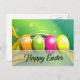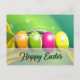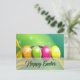 Colourful Easter eggs and a lovely Spring morning dew background with fresh leaves and little drops.