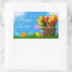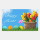Easter colours, sunny sky, blooming tulips, "Happy Easter," postcard.