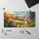 A picturesque spring landscape with rolling hills and blossoming trees stretches out in an idyllic, sunlit valley. A bright white Easter bunny sits attentively in the grass, surrounded by colorful, artfully decorated Easter eggs. The flowers in vibrant colors and the warm golden light of the setting sun lend the scene a peaceful and festive atmosphere. The elegant lettering "Happy Easter" hovers above the scene, underlining the festive mood.