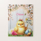 Cute baby chick wishing you Happy Easter with coloured eggs in a basket. you can also personalize this with a girls name