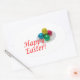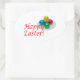 Happy Easter text of red colour and a white porcelain plate with four painted eggs of blue, green, red and yellow colours. Prints and gifts for everyone
