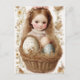 A label in an openwork frame for a package of quail eggs, a portrait of a cute girl close-up with a basket of eggs among quails, graphics, detailing, patterns, small round eggs with large multicolored spots, kids story book style, muted colours, watercolor style