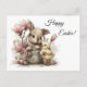 A Cute Happy Easter Greeting Postcard Designed With Pink Marigolds, Rabbit And Baby Chick