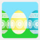 Beautiful and cute Easter design of multi-coloured, decorated green, blue and yellow Easter eggs motif against a powder blue background, reminiscent of a clear, blue Spring sky.