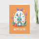 Designed with a stylized blue bunny at the center 🐰, the illustration uses soft rounded shapes, long ears, rosy cheeks, and a wide smile, with a small orange bow tie that adds a sweet, friendly touch. The bunny sits in front of a large white egg-shaped backdrop, like a spotlight that frames its face and makes the expression feel extra warm. Behind it, a soft orange field fills the scene, giving the cooler blues a gentle contrast and keeping everything bright and springlike. Around the bunny, decorated eggs in red, green, blue, and yellow are scattered with dots and stripes, like they were placed there for a shared little celebration. Along the bottom edge, purple flowers with yellow centers rise from leafy green stems 🌷, and the close spacing makes the scene feel like a cozy garden moment. Small white starburst shapes and faint circular accents float across the background, adding a light, dreamy sparkle without crowding the main figure. The words “HAPPY EASTER” appear in large white letters near the upper area of the design, clearly set against the orange background. A lavender bow sits on top of the white egg shape, and a tiny red strawberry appears nearby as a bright detail.