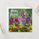 This flat card features a spring wildlife design, with a wild rabbit and tulip flowers. There is a holiday greeting "Happy Easter" on the front and on the backside. You may buy as shown of edit to add your own text.