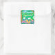 A bright and colourful sticker for Easter featuring three curious white rabbits looking at bright Easter eggs in a spring meadow with a shy owl in a tree and blooming purple crocus. Fun stickers for the holiday!