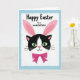 This card features a stylized cat face in a tuxedo-like black-and-white pattern, centered within a white rectangular panel that has a lightly textured, torn-paper edge against a soft sky-blue background. The cat’s large green eyes look upward with a gentle, curious gaze, and a small heart-shaped pink nose sits above fine black whiskers that sweep outward like a shy smile. Two tall pink bunny ears rise from the top of its head, giving the scene an Easter twist 🐰. A bright pink bow rests under the chin, adding a sweet, friendship-like touch, as if the character dressed up just to be noticed. Near the top of the white panel, the words “Happy Easter” appear in thick, friendly lettering, with “to a wonderful Sister” placed beneath in a thinner, flowing style. The text is set in a dark tone that stands out clearly against the white panel, keeping the layout easy to read. The overall palette stays calm and spring-ready, balancing the black-and-white face with lively pink accents and those glossy green eyes 🌷. The white panel sits neatly centered on the blue field, with the torn edge visible all around and the bunny ears extending into the open space above.
