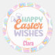 Cute and pastel coloured , playful typography with bunny ear accent and colourful Easter eggs pattern border.