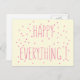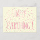 NewParkLane - Postcard, with fun quote 'happy everything' in pink, in modern typography, with sparkling stars, against a soft yellow background.