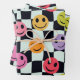 This is cute colourful happy faces on warped black and white checkerboards pattern.