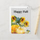This fall season postcard features pumpkin and sunflowers on a brown gingham background.