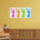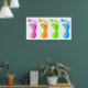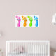 A row of four colourful human footprints with happy faces.