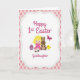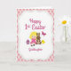 The front design shows a young blonde girl in a magenta dress sitting with a gentle smile, her posture turned slightly toward a friendly long-eared brown bunny 🐰 and a tiny yellow bird as if they’re sharing a quiet moment together. A striped oval egg in magenta and teal rests beside her, adding a festive touch to the scene. Above them, a small red-winged insect hovers, bringing a bit of motion to the soft palette. The illustration sits inside a wide area of creamy white space, framed by a scalloped edge with tiny dotted details. Outside the frame, the background is filled with soft pink and beige diamonds arranged like a light plaid fabric. At the top, a seasonal greeting appears in looping magenta lettering, while a shorter dedication line in matching magenta sits along the bottom margin beneath the picture 🌷. The border is scalloped in pale tones with evenly spaced dots tracing the curves.