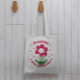 These bags were super cute (I purchased 3). The material is more of a canvas look & feel. The colour of the bag is slightly off white, but the letters look exactly as pictured. I took 3 photos in different lighting. Would recommend! I liked how there was an option to choose the font and colour of the name. The words are legible and the colours are exactly as pictured.