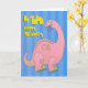 Big Pink dinosaur eating a leaf, with a birthday greeting on a blue background.