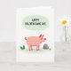 This animal greeting card features a bubblegum-pink cartoon pig with a simple shape, rosy cheeks, and a curly corkscrew tail. The pig looks a little shy, with eyes tilted upward and a small, content smile that feels sweet and friendly. It stands on a pale green patch of ground with a few deep green leaves nearby and a smooth gray rock off to the side. The background is plain white, keeping all the focus on the pig and its message. Above the pig, there’s a large light-green speech bubble that holds the main text. The words “HAPPY VALENTIN-SWINE DAY,” appear in black, block-style letters and sit centered inside the bubble. The pun adds a fun Valentine’s Day touch while still feeling warm and caring ❤️