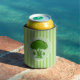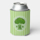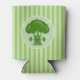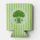 Green cartoon broccoli with a big happy smile on a green stripy background.
