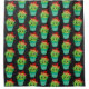 A shower curtain with a repeating pattern. A cute illustration of a plump round cactus, with big kawaii eyes, smiling and wearing a red sombrero. Standing inside a flower pot. The background is black.