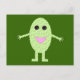 A cartoon of a smiling green grape with shiny black eyes and a pink mouth on a dark green background. This lighthearted and fun postcard would be great for the young and the young at heart.