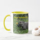 Photo of a groundhog in the grass, is printed on both sides of custom mugs. The text says, Happy Groundhog Day, and is written in yellow. The text can be customized with your own message' be sure to customize both sides. Thank you for shopping at CherylsArtPhotos on Zazzle.