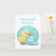 This adorable baby duck is taking a lick of a half birthday cake that has a half of the cake left with 1/2 cake decor.