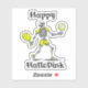 Happy Halloween and skeleton playing pickleball. Black and yellow colours used. Funny Halloween and pickleball pun.