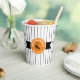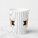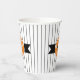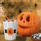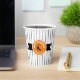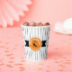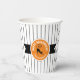 This paper cup features a black Halloween cat on a round orange and black label with the text 'Happy Halloween' in white. Personalise with your name or other text. Background is a narrow black and white striped pattern. Search ID686 to see other products with this design.