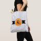 This cool tote bag features a black Halloween cat on an orange and black label with the text 'Happy Halloween' in white. Personalise with your name or other text. Background is a narrow black and white striped pattern. Search ID686 to see other products with this design.
