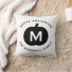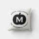 Fall home decor pillow features a black pumpkin with white custom monogram initial and modern "Happy Halloween" wording with custom family name text that can be personalized. Two sided throw pillow design in black and white colors.