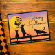 Adorable postcard that features a laughing moon playing with three cat silhouettes sitting on a fence at sunset. A very unique and cool way to let family and friends know that you are thinking of them at Halloween.