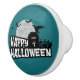 Happy Halloween text design illustration with cemetery and bats decoration at full moon on grunge blue background