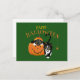 Cette carte postale présente la nature ludique des chats pendant l'Halloween, avec deux chats géométriques noirs et blancs qui s'amusent avec les mots "Happy Halloween". Un chat utilise un citrouille comme cachette, ajoutant un élément supplémentaire de plaisir au design.